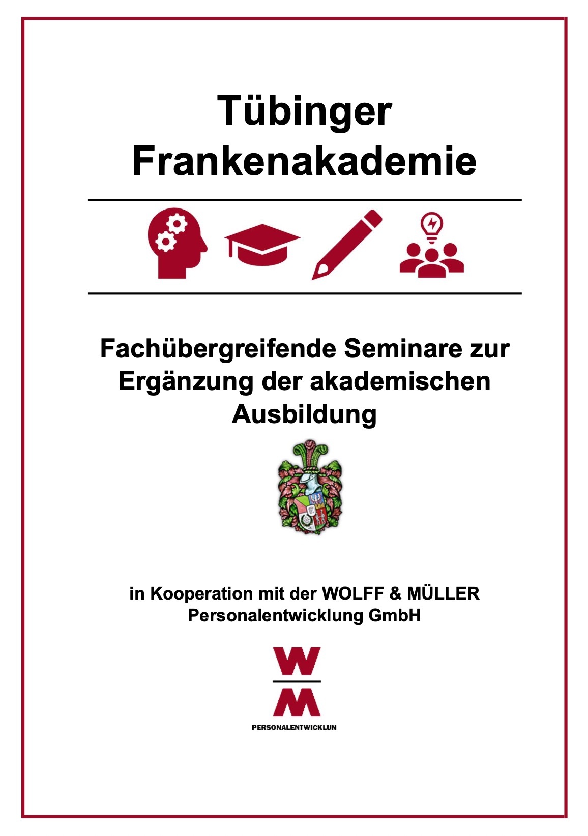 Die Frankenakademie steht allen Tübinger Studenten und Studentinnen offen. Sie wird in Kooperation mit dem Unternehmen Wolff & Müller (Stuttgart) durchgeführt. Alle Module werden von externen und professionellen Trainern unterrichtet. Die Teilnehmer der Frankenakademie treffen sich zweimal im Semester auf dem Frankenhaus für das gemeinsame Training. Jeder Teilnehmer erhält eine Teilnahmebestätigung ausgestellt. Die Frankenakademie ist aber noch viel mehr. Sie bedeutet gemeinsame Erfahrungen und Begegnungen, jede Menge Spaß sowie ein standortübergreifendes Netzwerk, auf das man sich auch im Alltag jederzeit verlassen kann.